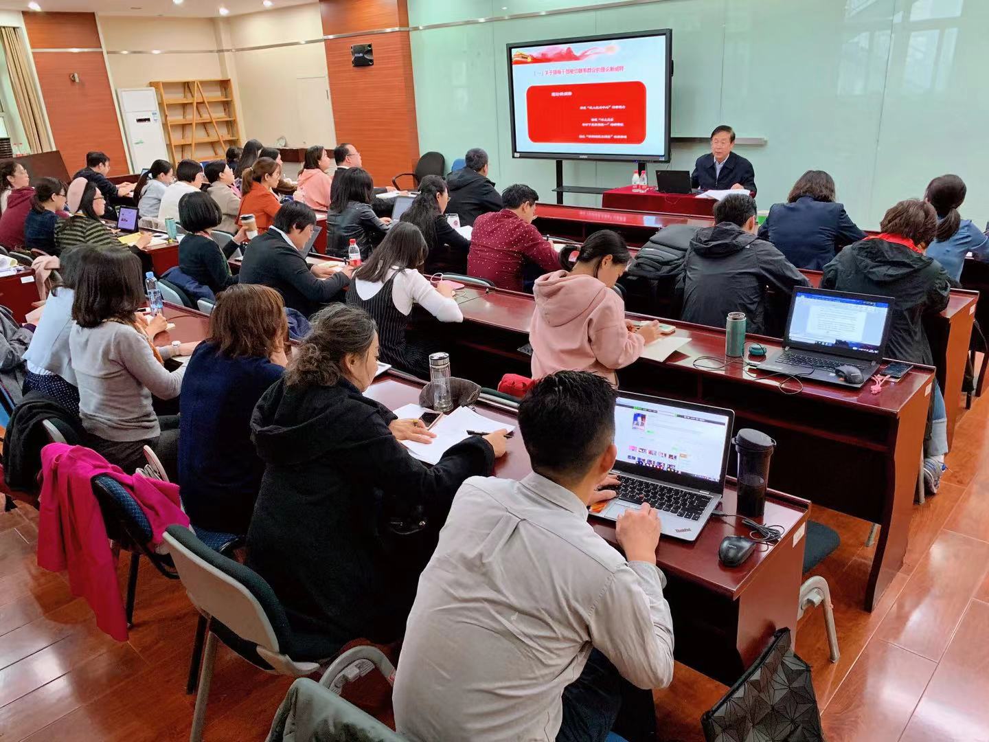10月16日下午,院第十三次集体“学习日”暨“不忘初心、牢记使命”主题教育学习活动举行。著名党建研究专家、全国党建研究会特邀研究员、辽宁省委省政府咨询委员、原大连市政协副主席王乃波应邀做了题为“新时代党员干部密切联系群众”的主题党课。活动由副院长赵义良主持,全院师生党员60余人参加学习。