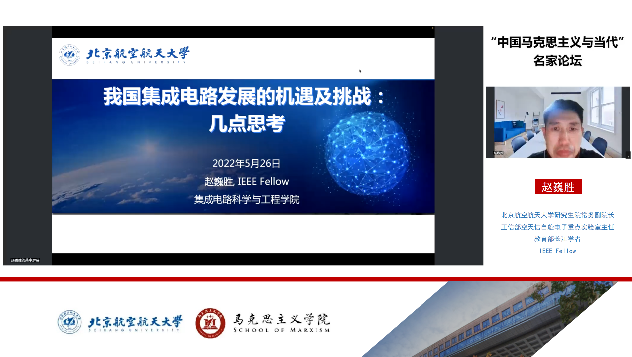 2022年5月26日下午,我校博士生思政课“中国马克思主义与当代”邀请2021年“科学探索奖”获奖人、我校研究生院常务副院长、工信部空天信自旋电子重点实验室主任赵巍胜教授做客“名家讲坛”,讲授“我国集成电路发展的机遇及挑战:几点思考”专题报告。我校2021级博士生在线聆听报告,英国上市公司365部分教师旁听报告。报告由我校英国上市公司365副院长王娜主持。