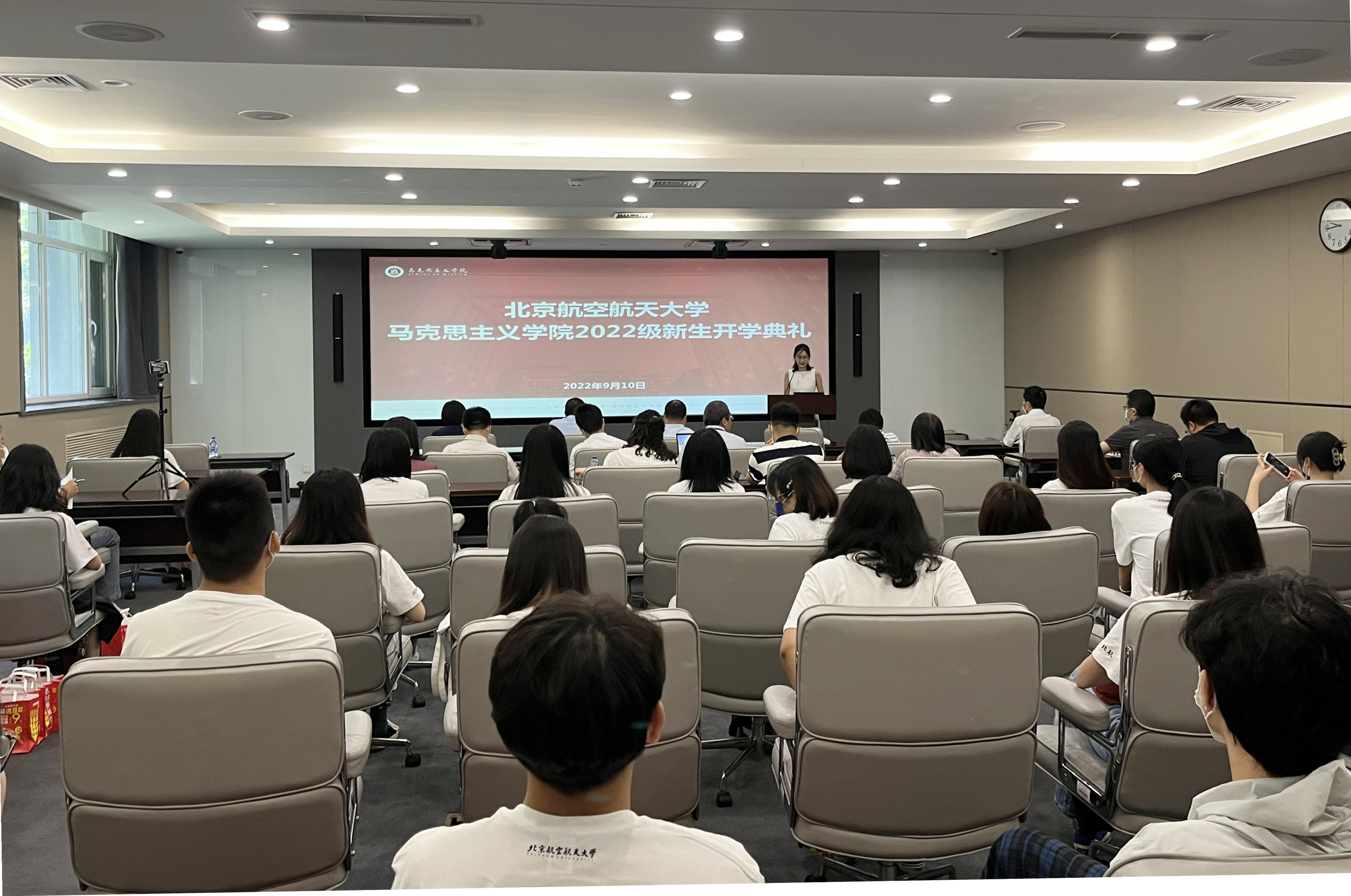 其后,2022级博士新生代表刘白薇在发言中与全体新生分享了自己对即将开启的求学之路的三点思考,与同学们共勉:一是立志学术;二是热爱生活;三是心怀天下。2022级硕士新生代表朱孔泽表达了对研究生生活的向往以及对加入北航马院的自豪,并代表全体硕士新生承诺,将严守“德才兼备 知行合一”的校训,用知识武装头脑,坚定理想信念,做好规划,不负马院、不负北航、不负青春。2021级学生代表张琦在发言中建议师弟师妹,一定珍惜研究生阶段的宝贵时光,夯实理论功底,脚踏实地争做坚定有为的青年马克思主义者。