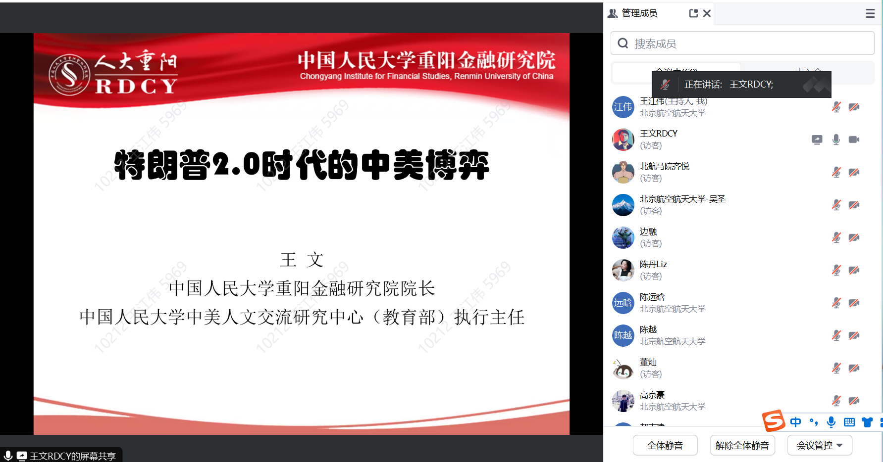 王文,中国人民大学重阳金融研究院院长[区域国别研究院(重阳金融研究院)院长]、丝路学院副院长、特聘教授、博士生导师,中美人文交流研究中心(教育部)执行主任,中国金融学会绿色金融专业委员会秘书长、国务院参事室金融研究中心研究员,中国人民外交学会理事,欧美同学会理事,莫斯科国立大学、兰州大学等国内外10多所知名大学客座教授。走访调研近百国(包括南极点),撰写的研究报告多次获党和国家领导人批示与肯定。曾获2017年文化名家暨“四个一批”人才、2019-2024年连续获人大“国家高端智库”建设先进个人奖或优秀党员、2020年国家“万人计划”哲学社会科学领军人才、2022年(第八届)中华优秀出版物奖等荣誉。2016年习近平总书记主持哲学社会科学工作座谈会,王文是十位发言学者之一。