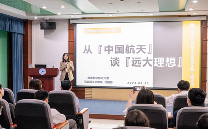 在我院领导及教师陪同下,北研中心统战人士、青年人才代表一行首先参观了航空航天博物馆、校史馆和图书馆,全方位了解新中国航空史和北航发展史。随后,我院青年教师付丽莎副教授又以《从“中国航天”谈“远大理想”》为题,向参加活动人员讲授了一堂生动的党课。最后,双方参会人员又围绕理想信念教育、党团及统战工作开展经验等展开座谈与交流。