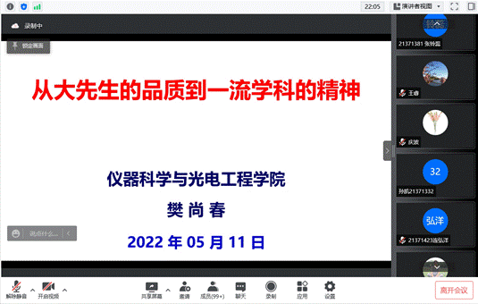 樊尚春在主题报告中重温了总书记关于教师要做教书育人“大先生”、“经师”与“人师”的统一者等嘱托,回顾了我校仪器学科在空白中开创、在困难中坚守、在机遇中发展的奋斗历程,结合林士谔先生在人才培养、科技创新中的生动事迹,事理、情理交融地诠释了其爱国、创新、奉献品质。樊尚春强调在三代陀螺人接续奋斗中形成的“心怀祖国、勇于创新、甘于奉献”的陀螺精神是仪器学科、仪器类专业的精神财富。